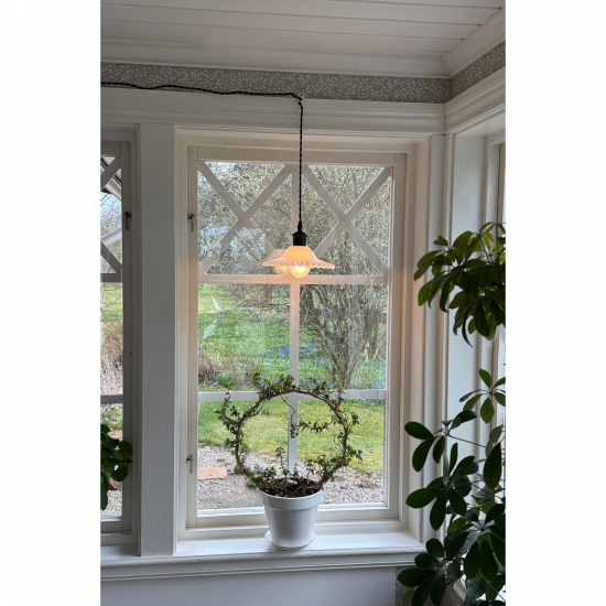 Den tvinnade textilsladden, metallupphänget och skärm av vitt glas som har en vackert böljande volang i nederkanten fulländar den härliga vintagekänslan.