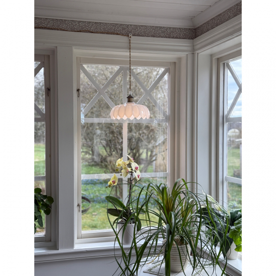 Den tvinnade textilsladden, metallupphänget och skärm av vitt glas som har ett blomsterinspirerande känsla i nederkanten fulländar den härliga vintagekänslan.