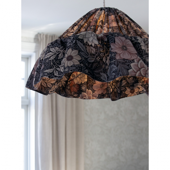 Vilken underbar känsla denna taklampa ger i rummet med sin fina textil och mönster från Borås Tapeter.
