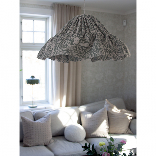 Vilken underbar känsla denna taklampa ger i rummet med sin fina textil och mönster från Borås Tapeter.