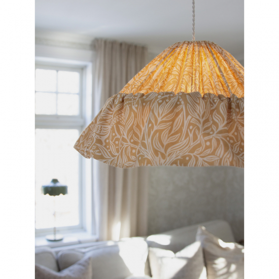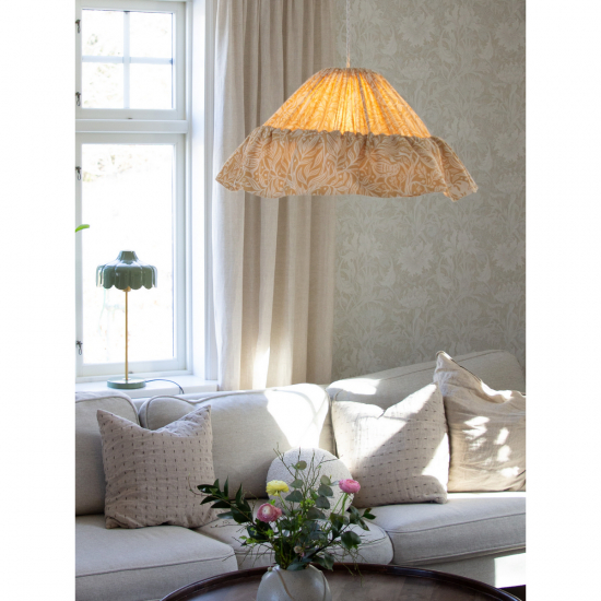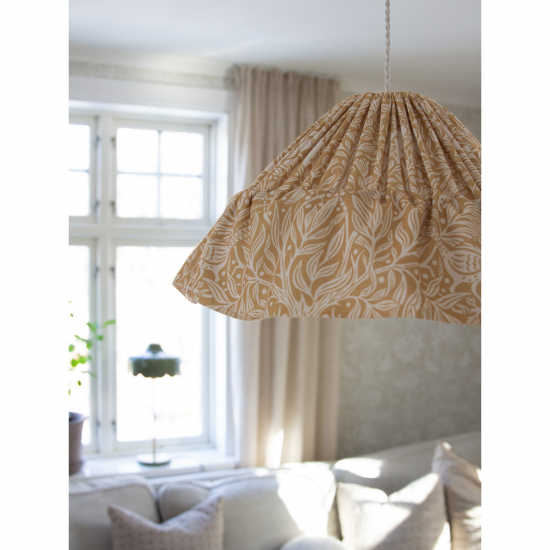 Vilken underbar känsla denna taklampa ger i rummet med sin fina textil och mönster från Borås Tapeter.
