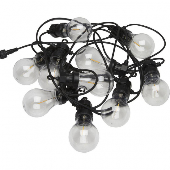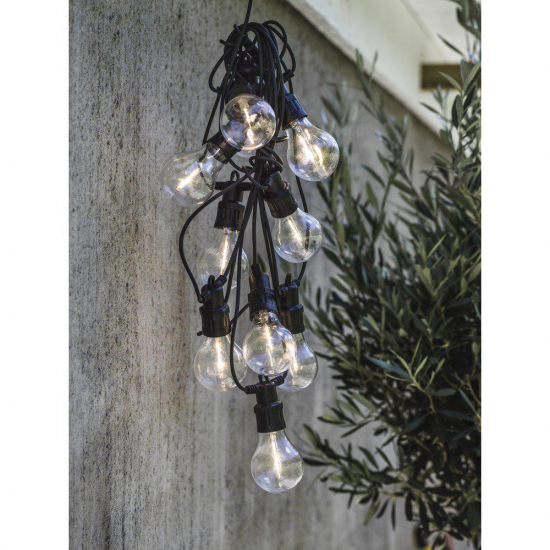 Glow ljusslinga, skapa stämning inomhus, på din uteplats eller balkong. Svart ljusslinga med 10st, fasta ej utbytbara, lampor i klart plastglas (PET). Lamporna ger ett varmvitt sken, 2700K. 40 lumen. Lamphållarna har en liten krok längst upp som du kan använda till att hänga upp i tex en lina. Ljusslingan är 8,7m lång och det är 4m till första lampan, därefter 0,5m mellan varje samt en liten kort svans vid sista lampan. IP44 för inom- eller utomhusbruk. Denna lågvoltsslinga har en rund tunnare kabel och transformator. Totala längden är 8,7m. Går ej att bygga på fler slingor.